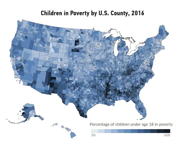 根据哥伦比亚大学的 国家儿童贫困中心,美国所有儿童中有21%生活在收入低于联邦贫困线的家庭中。根据县健康排名报告,儿童贫困率最高的地区是农村县——这些地区有23.2%的儿童生活在贫困中——紧随其后的是大型城市(21.2%)、小型城市(20.5%)和最后的郊区县(14.5%)。在整个国家中,儿童贫困率在西南和东南县以及阿巴拉契亚、密西西比三角洲和大平原的部分地区最高。