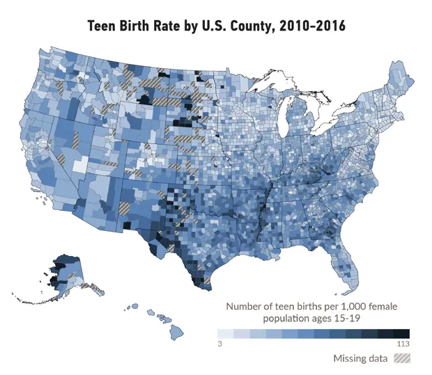 贫困与青少年怀孕之间有着密切的联系。尽管青少年出生率目前处于历史最低水平——自1991年以来下降了67%——但这些改善主要局限于东海岸和西海岸。根据报告,尽管沿海地区有所改善,但西南部和东南部,以及阿巴拉契亚、密西西比三角洲和大平原地区在过去十年中几乎没有变化。