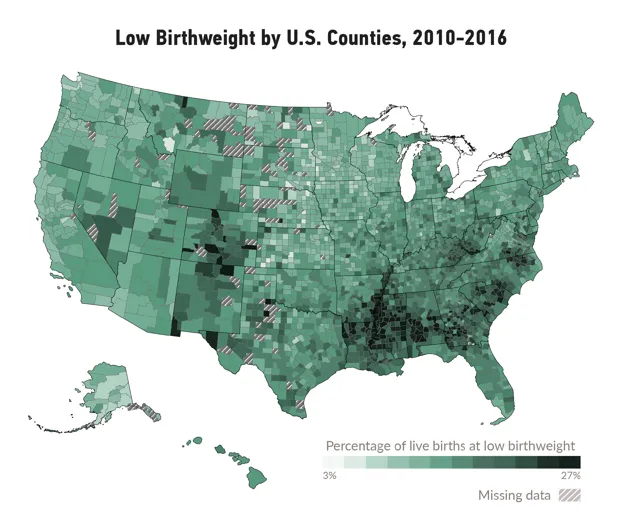 在许多县,不仅仅是种族,而是种族、地点和收入的组合产生影响:虽然在某些地方,西班牙裔和亚裔婴儿的低出生体重比例低于白人,但在其他地方情况并非如此。但在大多数县,黑人和美洲印第安人/阿拉斯加原住民母亲所生低出生体重婴儿的比例高于其他种族和民族群体,而对于黑人而言,这一差异相当显著。