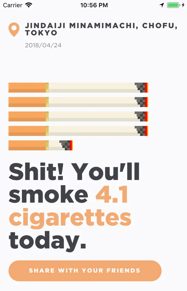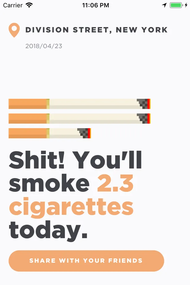 *我靠, 我吸烟!*是由巴西出生的设计师 马塞洛·科埃略 和巴黎出生的应用开发者 阿莫里·马丁尼 在短短一周内创建的,他们在阅读了一项分析空气污染及其与吸烟等价的研究后。该 文章——由 理查德·穆勒共同撰写,他是麦克阿瑟奖获得者和加州大学伯克利分校的物理学教授——解释了一个数学模型,该模型将吸烟和与烟草相关的死亡与PM2.5的水平进行比较,PM2.5是一种在燃烧后成为危险的、致癌的污染物的微小颗粒。