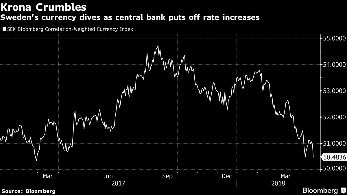 克朗崩溃为长期受苦的克朗多头祈祷。瑞典的货币不仅因为国家中央银行不断推迟加息而受到重创,还因为它向投资者发出矛盾的信息。周四,一项衡量该货币与九个发达市场同行的彭博指数交易于2017年2月以来的最低点,使其成为当天、上周、上月、三个月和六个月以来表现最差的货币,此前瑞典央行决定将主要利率维持在负0.5%。政策制定者周四宣布,他们认为在“到今年年底之前”不会收紧政策。根据彭博新闻的阿曼达·比尔纳和拉法埃拉·林德伯格的报道,这与之前对“今年下半年”的评估相比有所不同。Bleakley金融集团的首席投资官彼得·布克瓦在一份研究报告中指出,瑞典央行的货币前景中的“矛盾”让人“痛苦不已”。负利率的一个关键原因是保持克朗对欧元的疲软并刺激通货膨胀。但瑞典央行行长斯特凡·英维斯交替表示“克朗的疲软超出了预期;克朗的疲软是暂时的;合理假设克朗长期会走强;重要的是克朗不会过快走强;短期内货币预测很难。”