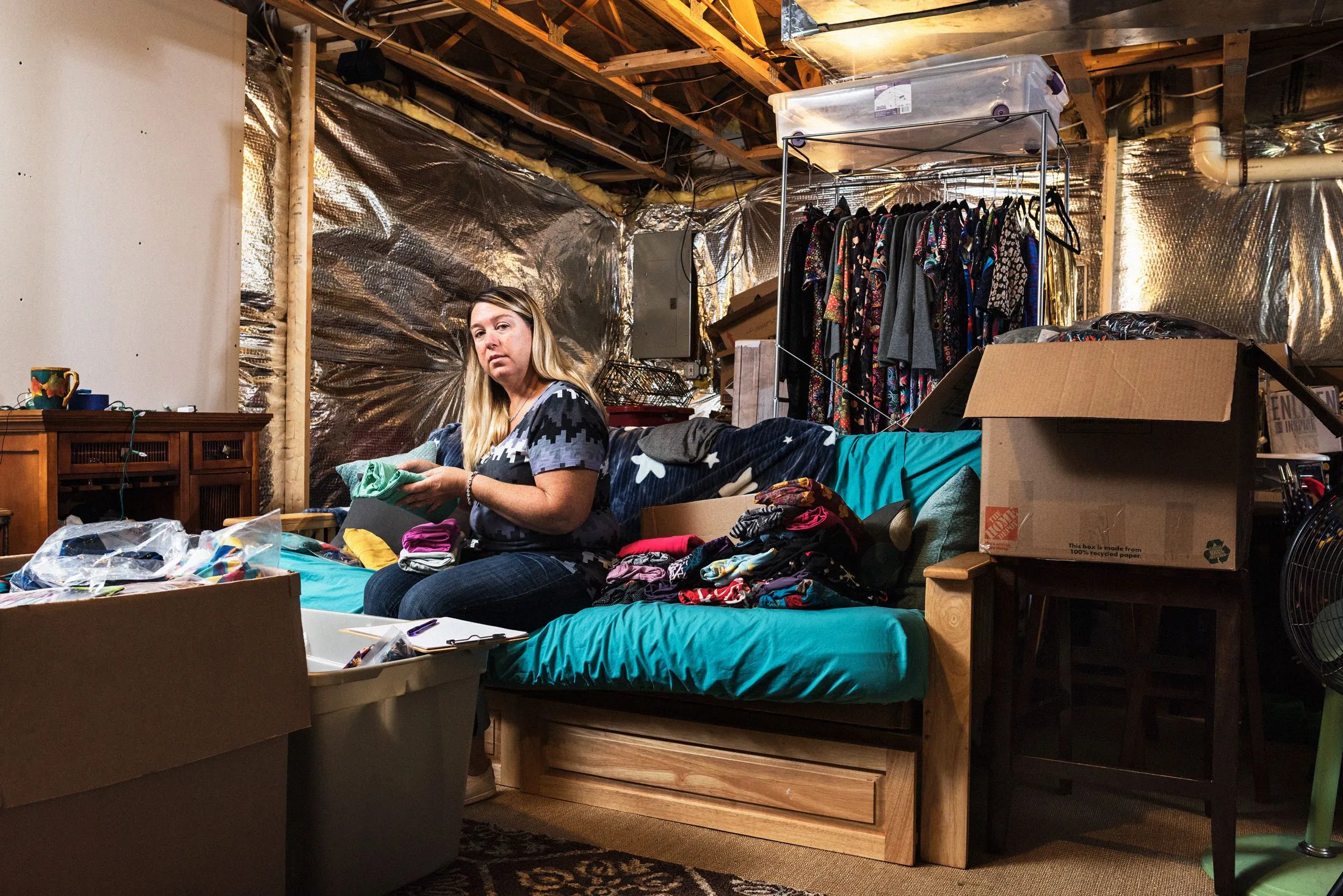 Amy Jo Reece在弗吉尼亚州的Culpepper的地下室里,和她未售出的库存。
