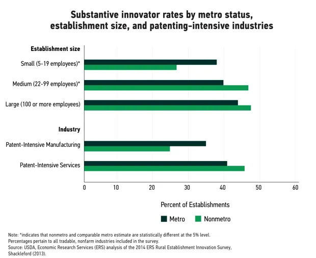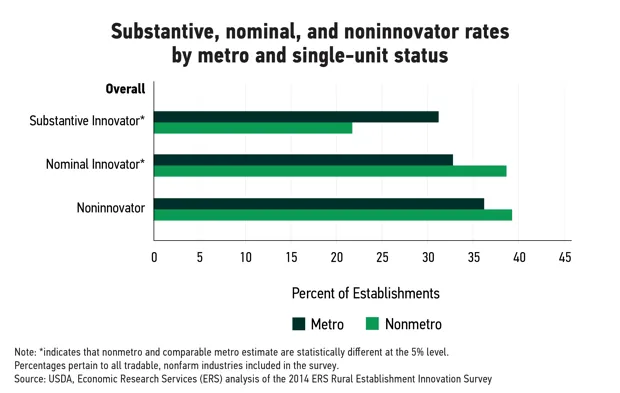 一系列来自 研究 的 蒂姆·沃扬 和他在美国农业部的 经济研究服务 的同事们记录了农村创新的驱动因素。他们的发现基于多种数据集,包括一项大规模调查,该调查比较了城市和农村地区的创新,称为 农村企业创新调查 (REIS)。这项调查基于大约11,000个在可交易行业中至少有五名付费员工的商业机构——即生产可以或可能被国际交易的商品和服务的部门——在农村(或非大都市)和城市(大都市)地区。