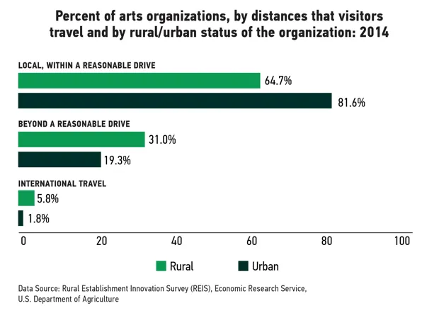 农村和城市艺术区之间最显著的区别是人们必须旅行的距离:农村艺术组织报告称31%的访客旅行“超出合理距离”来访,而城市地区为19%。