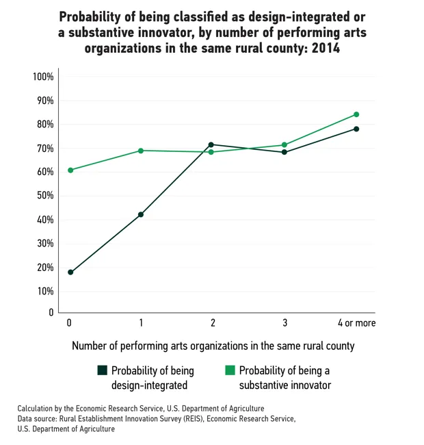 数据来自NEA。图表由Madison McVeigh/CityLab制作如果说有什么的话,艺术对农村创新的重要性可能甚至超过城市创新。虽然我自己的研究已经将艺术与城市地区创新高科技初创企业的集群联系起来,但Wojan和他的同事Bonnie Nichols的数据表明艺术与农村地区创新之间的联系更为紧密。根据NEA的论文,农村企业成为实质性创新者的概率从没有表演艺术组织的农村县的60%上升到举办两到三个的县接近70%,如果一个农村县举办四个或更多,则高达85%。