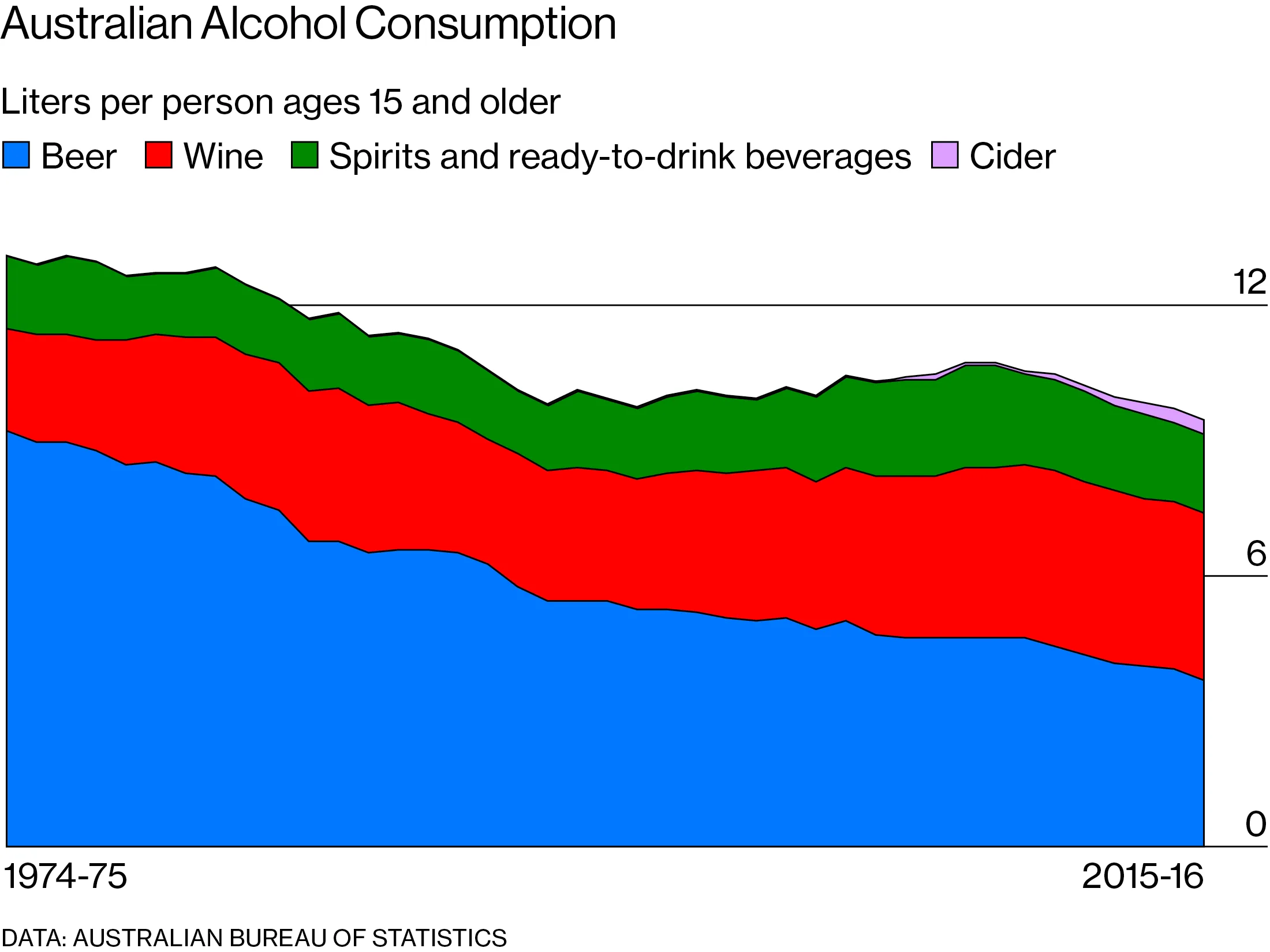 四十年前,澳大利亚人每年通常消耗13升(3.4加仑)的纯酒精,其中超过三分之二来自啤酒,根据澳大利亚统计局。如今,他们每年减少到9.7升纯酒精,啤酒贡献略超过三分之一。(消费1升纯酒精意味着饮用约29升中度酒精啤酒。)澳大利亚的总啤酒消费量已减少一半以上,降至每人每年89升,低酒精饮料占总量的四分之一。