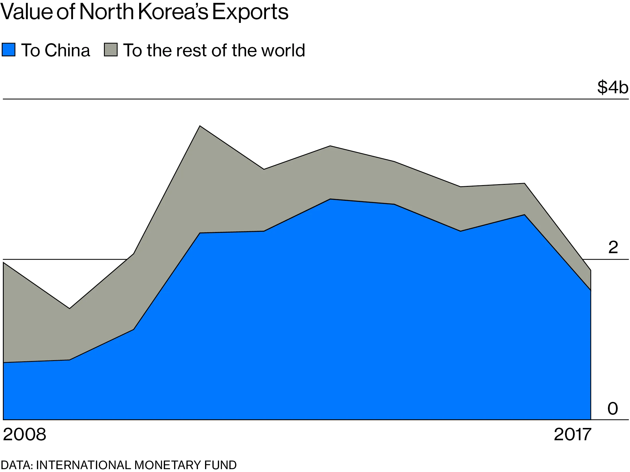 在这里,金正恩有最大的收益。制裁对朝鲜造成了严重损失。虽然没有可靠的官方经济数据——外部估计必须通过推断食用油消费等创造性方法来进行——这无疑是一个贫穷的国家。根据韩国中央银行的数据,2016年朝鲜的名义国内生产总值约为300亿美元(人均1300美元),而南方为1.4万亿美元(人均超过27000美元)。根据国际货币基金组织的数据显示,联合国制裁发挥了作用,使朝鲜的出口从2012年的35亿美元降至去年的19亿美元。这使得朝鲜依赖中国进行86%的出口,是十年前的两倍多。彭博经济学的分析认为,外汇储备的紧缩可能促使金正恩走上谈判桌。