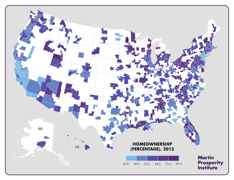 洛杉矶的房主不到一半,而纽约都市区的房主大约也只有一半。圣地亚哥的房屋拥有率为52%,旧金山为53.5%,圣荷西为56%,奥斯丁为57.5%。即使在止赎危机之后,锈带城市的房屋拥有率仍然高得多:大急流城为72%,匹兹堡、伯明翰和明尼阿波利斯–圣保罗为69%,底特律和圣路易斯为68%。锈带的小城市和佛罗里达的退休社区的房屋拥有率超过75%或80%。