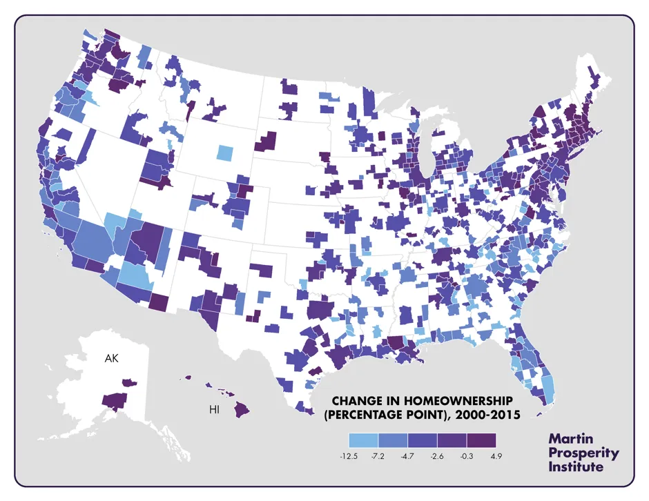 全国近四分之三的大型邮政编码在2000年至2016年间房屋拥有率下降。房屋拥有率显著增加的社区往往是快速城市化的地区。这些地区经历了富裕业主的涌入,取代了经济条件较差的租户。一个例子是位于亚特兰大的乔治亚理工学院周边地区,房屋拥有率从13%增加到32.5%,而中位收入则增长了三倍。