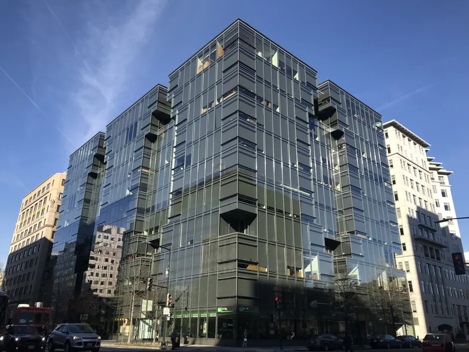 紧邻2112宾夕法尼亚的是乔治·华盛顿大学拥有的一块混凝土板,具有1960年代机构现代主义的网格深度,我怀疑它在回顾时看起来比当时更好。对面,它1997年的邻居则截然不同:一座长方形的庞然大物,是国际金融公司所在地。