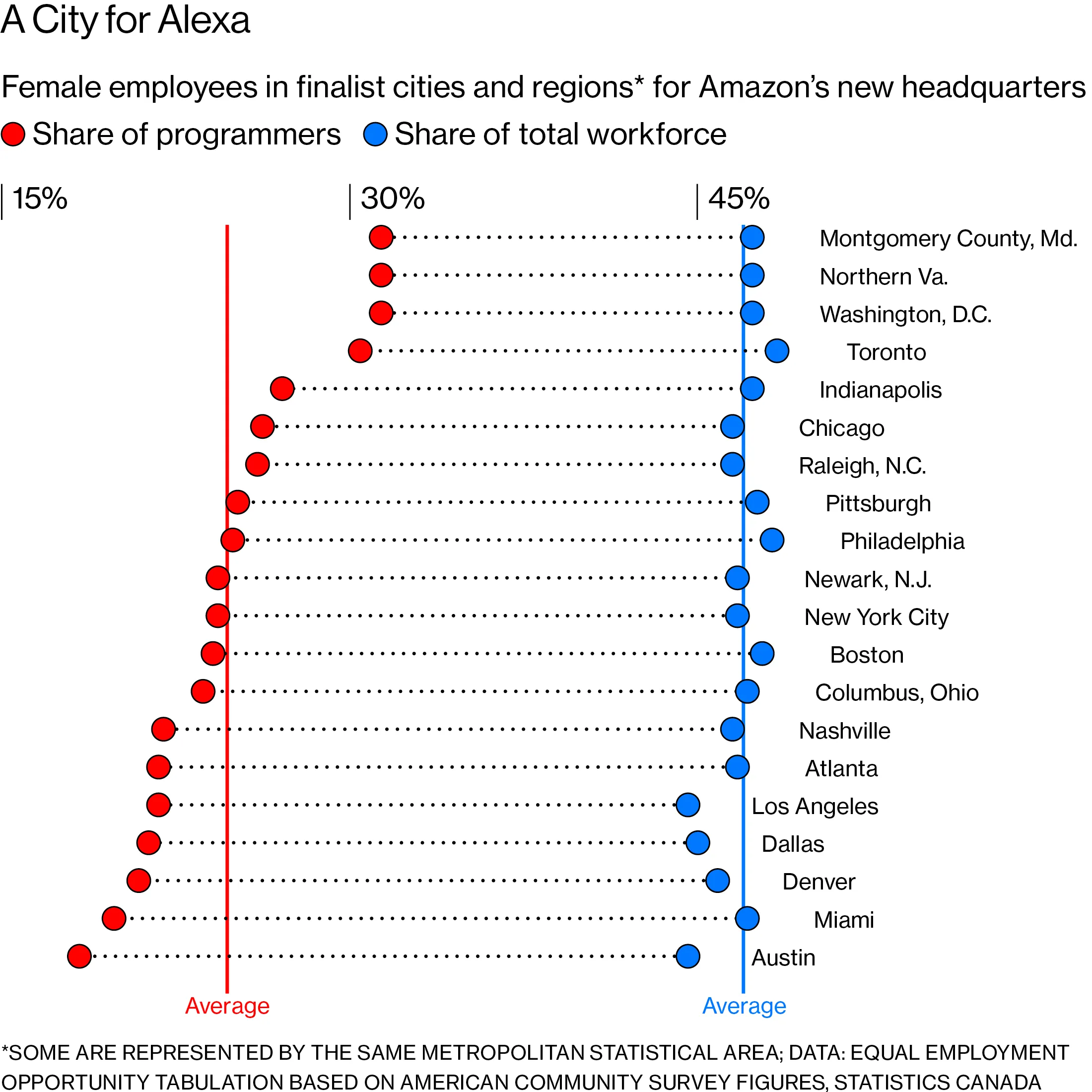 如果是这样,亚马逊应该在芝加哥建立HQ2。或者多伦多,或者华盛顿特区。我们查看了劳动力的人口统计数据,在公司短名单上的20个大都市区中,这些是唯一在三个相关多样性指标上高于平均水平的地区:劳动力中有色人种的百分比、程序员中的女性与男性比例,以及劳动力中女性的整体参与率。(对于那些试图评估的人来说,多伦多由于位于美国之外,通常被认为是反特朗普的选择;华盛顿将使贝索斯靠近国会大厦和他拥有的报纸;芝加哥则缺乏其他两个城市的政治色彩。)