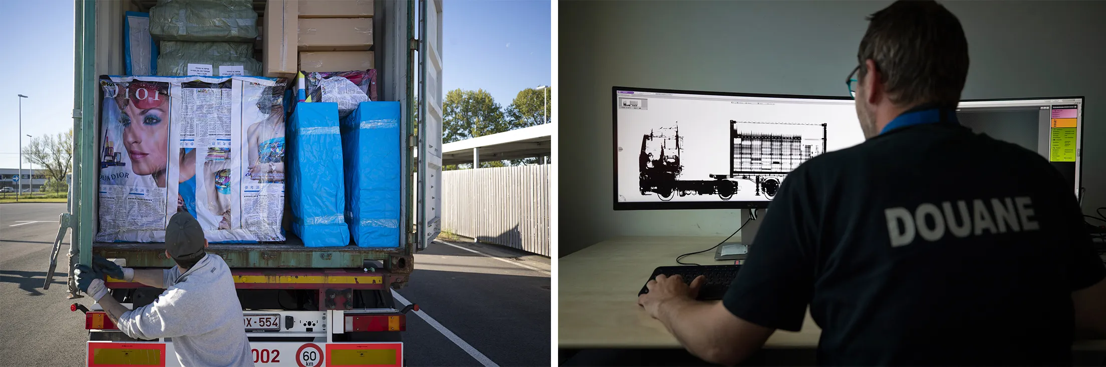 左:加布里埃尔·马尔塔克打开一个运输集装箱。右:一名海关工作人员检查卡车的X光。摄影师:贾斯珀·朱宁/彭博社与欧洲大多数港口一样,泽布鲁日的海关当局并不检查所有来自非欧盟国家的货物,而是使用一种“风险分析”系统对货物进行抽样。这种方法覆盖了泽布鲁日约1.5%的非欧盟货物,根据比利时财政部发言人弗朗西斯·阿丁斯的说法,该部门负责国家的港口检查。