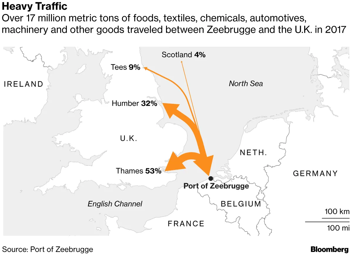 该港口自称是世界上新的汽车运输中心,是比利时仅次于安特卫普的第二大港口,与英国经济深度融合。泽布鲁日对往返英国的货运延误的威胁突显了脱欧的广泛经济风险,尤其是对英国而言,其一半的贸易与欧盟其他国家进行。