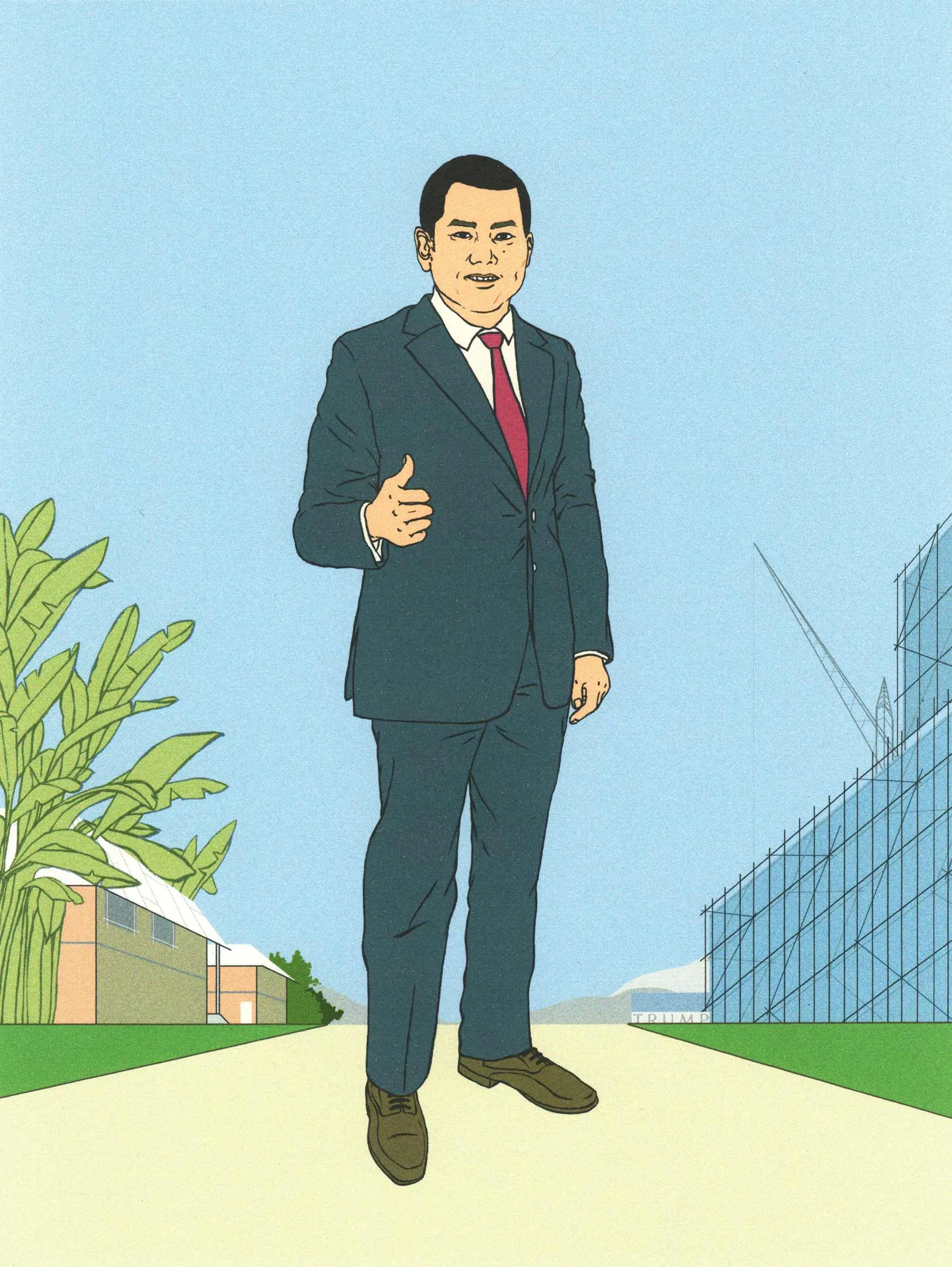 插图:Manshen Lo 为《彭博商业周刊》绘制像某些大亨一样,包括他最渴望结交的那位,哈里·塔诺索迪布乔在他的办公室里挂满了自己的照片、画作和漫画。在雅加达市中心的高楼的一侧,电视机播放着他拥有的新闻频道之一。对面书架上,放着一顶由另一位大亨、美国总统唐纳德·特朗普签名的“让美国再次伟大”帽子。在一对棕色皮椅之间,有一张木桌,上面展示着一张几乎像神龛一样的照片——塔诺索迪布乔与他的妻子莉莉安娜和特朗普的合影,特朗普在上面签名并写道:“哈里——你是我的好朋友。感谢你的支持。我不会忘记——祝好,唐纳德。”