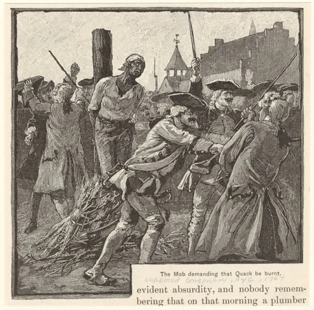一群暴徒要求在1741年将一个名叫Quack的奴隶烧死。Quack被判定为在城市纵火的罪犯;历史学家一致认为他的罪责值得怀疑。纽约公共图书馆但与狂欢节般的骚乱相伴的是非裔美国人的起义——包括奴隶和自由人,以及白人暴徒对黑人的攻击。这些攻击超出了仪式性的范围;它们构成了彻头彻尾的种族主义暴力。