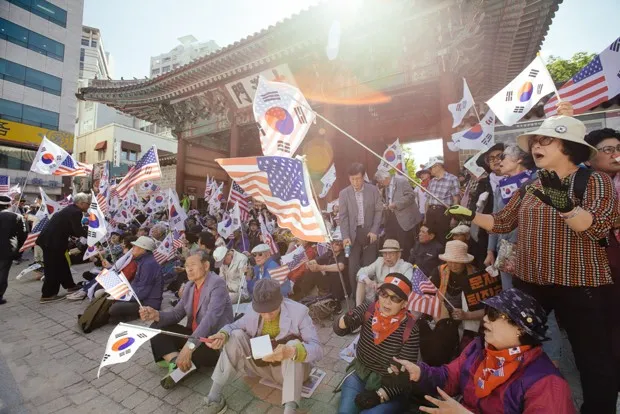 特朗普在首尔最大的支持者可能是极右保守派团体的成员。韩国保守派传统上对北方采取强硬立场,他们强烈支持与美国的同盟关系。一年多以来,一群极端保守的韩国活动者每周六在首尔市中心附近的繁忙街道上集会示威。许多人呼吁对北朝鲜采取美国军事行动。退休人员尚义心表示,他曾在洛杉矶生活,他不相信与北朝鲜的和平谈判会成功。“这就是为什么我们需要特朗普在平壤投下炸弹,”尚说。“投下炸弹。一次就够了。”