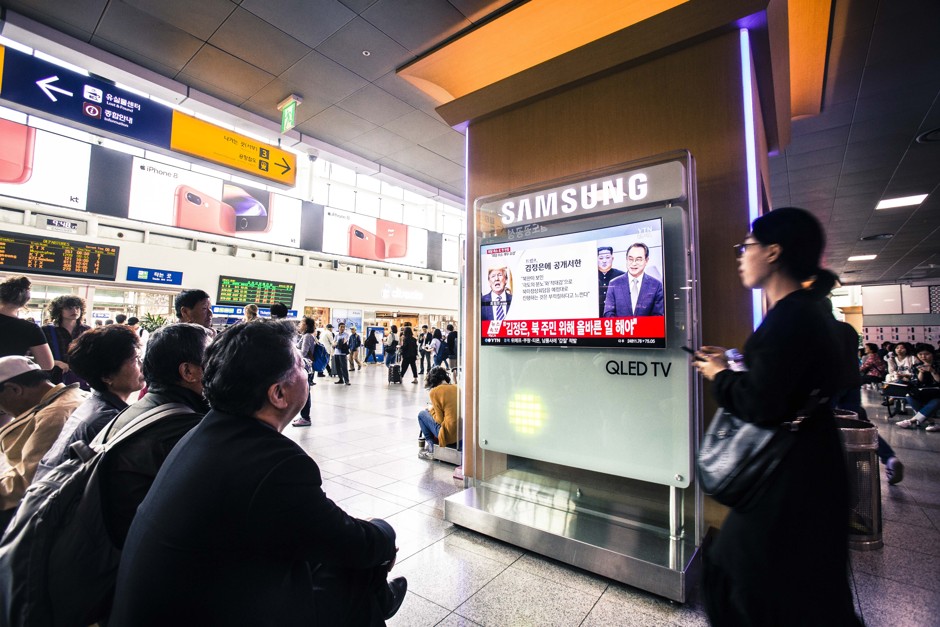 首尔的通勤者观看关于美朝峰会取消的新闻。Mikensi Romersa/CityLab韩国首尔——周五清晨,一群在首尔站等候火车的通勤者聚集在大屏幕电视前,观看美国总统特朗普与朝鲜领导人金正恩备受期待的峰会 正式取消。