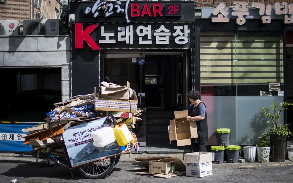 一名女性在弘大地区收集纸箱进行回收。Eli Imadali/CityLab与此同时,常常被忽视的是那些使这个复杂的数据驱动社会运作的人。在新的CityLab系列《首尔故事》中,我们将追寻这个地球上最技术饱和的城市之一的灵魂(抱歉)。这些故事部分是关于年轻与老龄化,以及面临一个即将爆发的人口时间炸弹,而仅靠技术无法解除:这是发达国家中老龄化速度最快的社会。在这个过程中,一方面是那些在战争后建设城市的老年公民,却因自己的成功而被抛在了后面。另一方面是那些迄今为止抵制政府呼吁组建自己家庭的年轻首尔人。不可避免的是,首尔的核武器邻国北朝鲜在这个社会上投下了自己的阴影——尤其是现在,两国在和平与可能的统一前景上进行微妙的外交舞蹈。