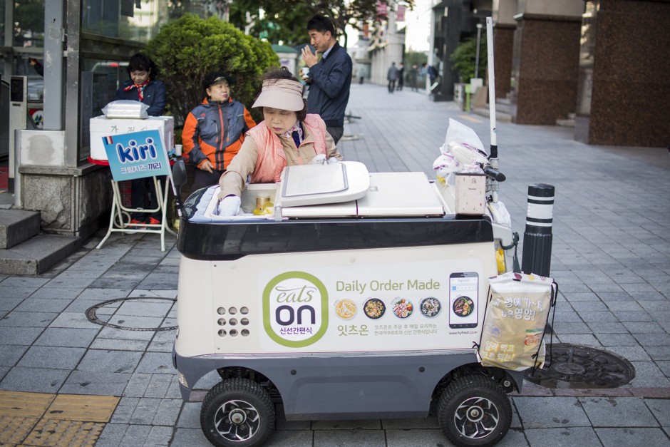 一位“酸奶阿姨”在她的电动冰箱里出售冷饮。埃利·伊马达利/城市实验室首尔的节奏令人眩晕。它不会为任何人停下。在这个拥有约1000万人的韩国城市的繁忙街道上,如果你在行人道中间停下,路过的行人会毫不在意地从你身边走过,眼睛盯着手机。街道和人行道上是自行车、汽车、公交车和行人的混合交通。城市复杂交通生态系统中一个显著的部分:骑着摩托车飞驰而过的外卖员。得益于韩国的按需文化,主要由大量移动应用推动,餐点必须快速且热乎。