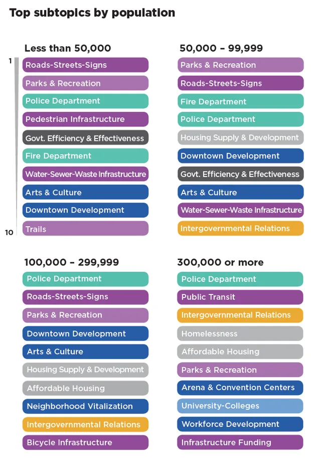 撇开政治背景不谈,根据NLC对160篇在线演讲的分析,大多数市长的首要优先事项没有改变。市长们最常讨论的优先事项仍然是经济发展,最近的重点是市中心的复兴。街道和标志在各个地理区域中排名靠前,除了最大的城市之外,其他城市也如此。公共安全仍然是一个重要关切,尤其是在今年,谈论警察的问题。