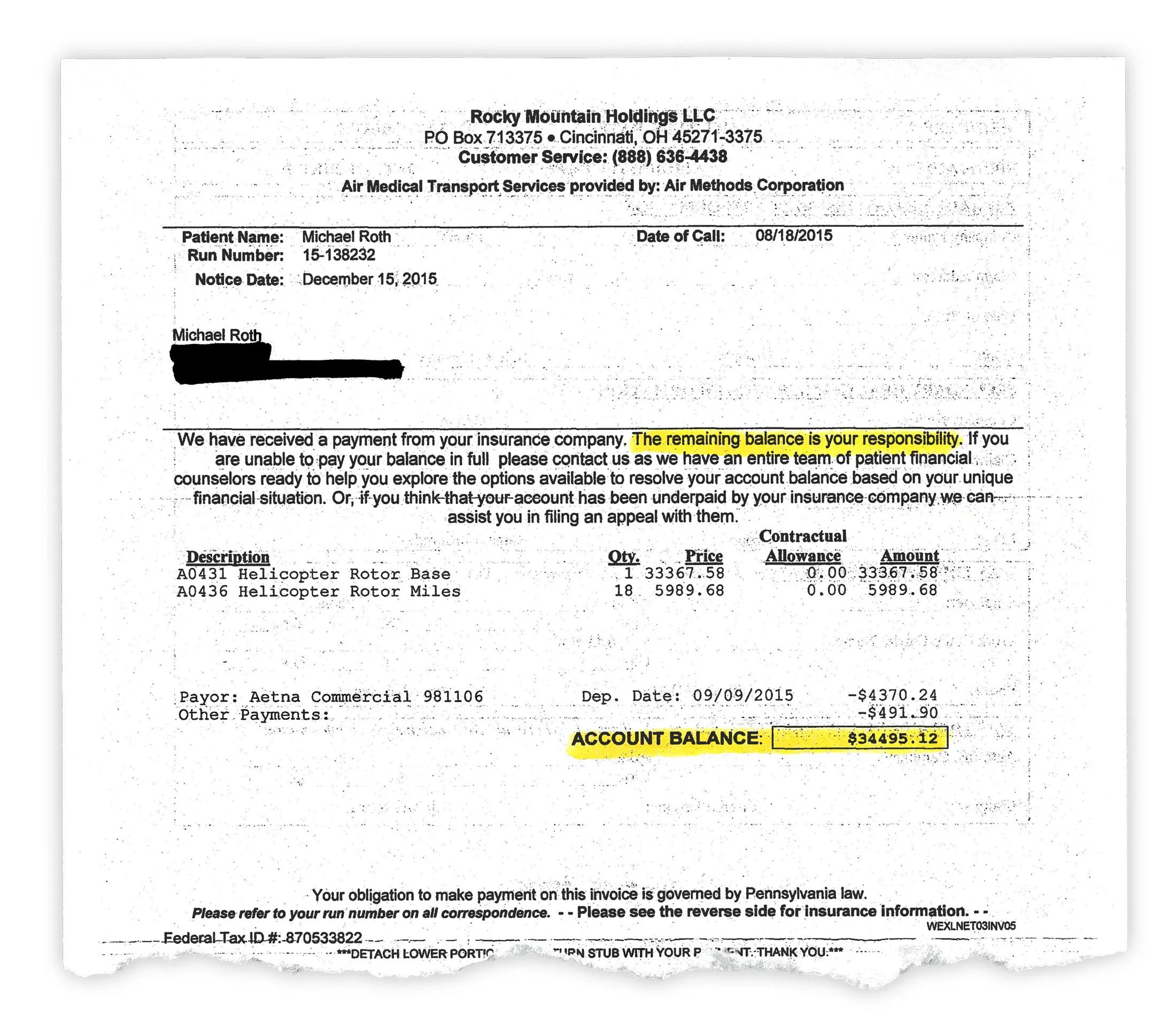 55岁的Roth因伤去世。在工人赔偿保险拒绝支付飞行费用后,他的Aetna Inc.医疗计划支付了4,370美元,而空中救护公司Air Methods的子公司Rocky Mountain Holdings LLC则向家人发送了一张34,495美元的账单。空中救护公司对Roth的遗产进行了留置,阻止Erin出售她父亲的房子。争议持续了两年,直到一位Roth联系的电视记者对此进行了调查,Aetna才支付了剩余的索赔。