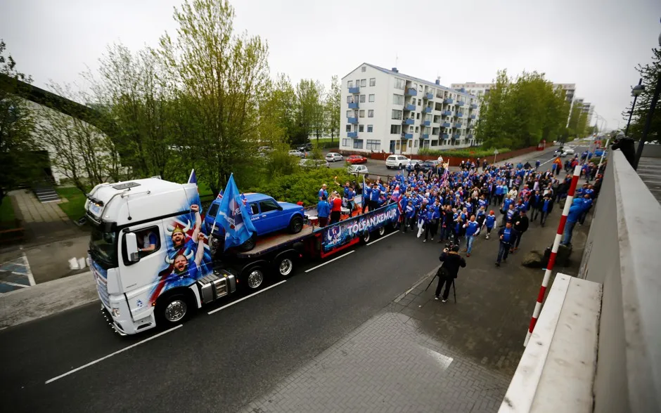 冰岛球迷在雷克雅未克的劳加达尔斯沃尔体育场外,参加与挪威的国际友谊赛,时间是6月2日汉尼拔·汉施克/路透社这是可以理解的。在这样一个小国,国家足球队的晋级几乎是一件家庭事务。并不是说 每个人 都认识每个人,但很多人会认识某个认识某个球员的人。为了应对人群,整个城市的公园、酒吧和酒店都在设置大屏幕。对于那些更具艺术气息的足球爱好者,甚至在 雷克雅未克艺术博物馆有直播,球迷可以在这里观看比赛,背景音乐由当地电子音乐作曲家/表演者Þóranna Björnsdóttir精心编排。