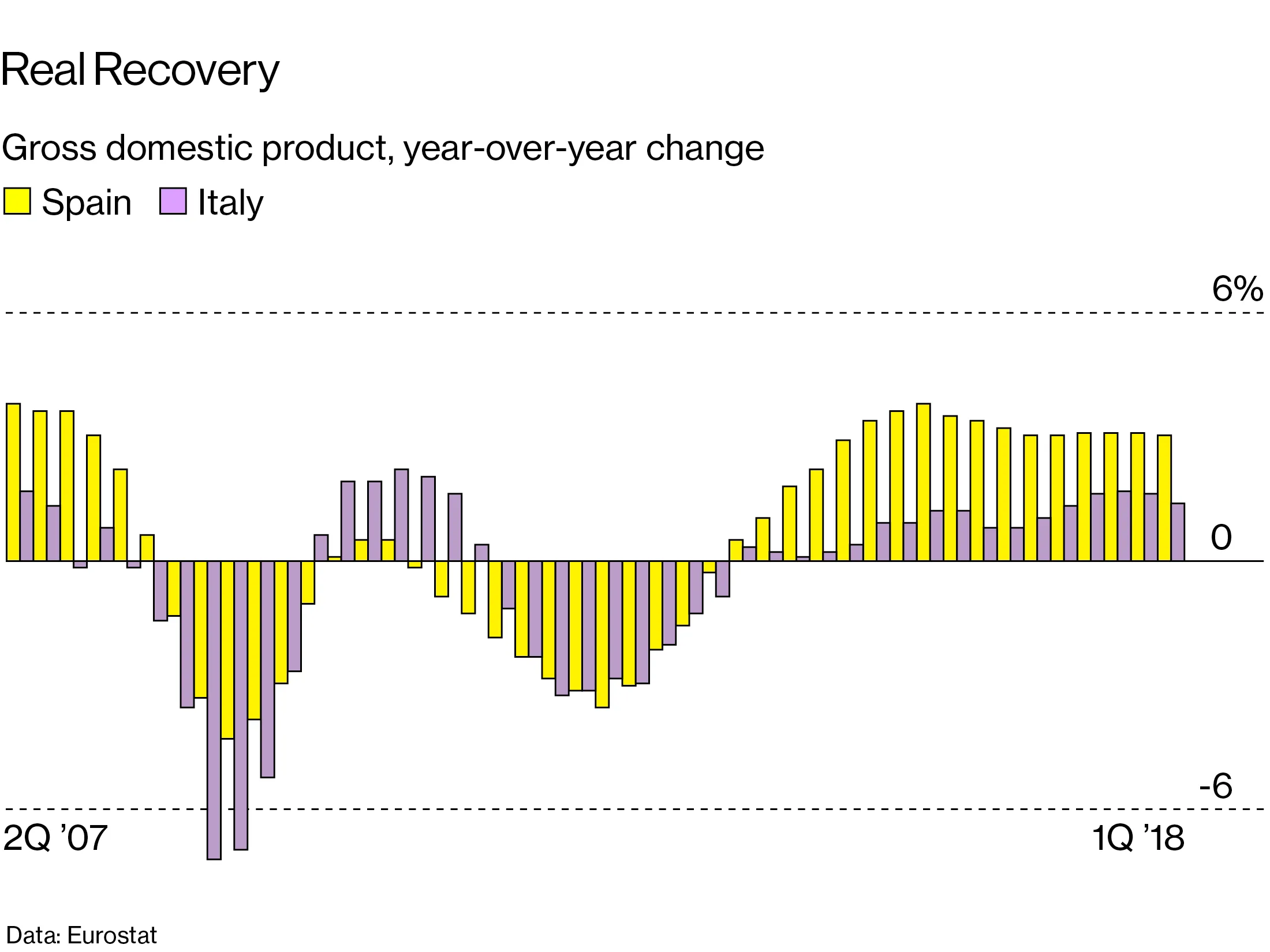 即使是 本月马里亚诺·拉霍伊首相的突然罢免也无法动摇投资者对西班牙复苏的信心,而意大利的复苏看起来越来越脆弱。西班牙政府债券的收益率大致与6月1日国会投票罢免拉霍伊之前的水平相当。地中海国家的不同命运反映在它们的10年期主权债务利差上,这是自2012年以来的最高水平。
