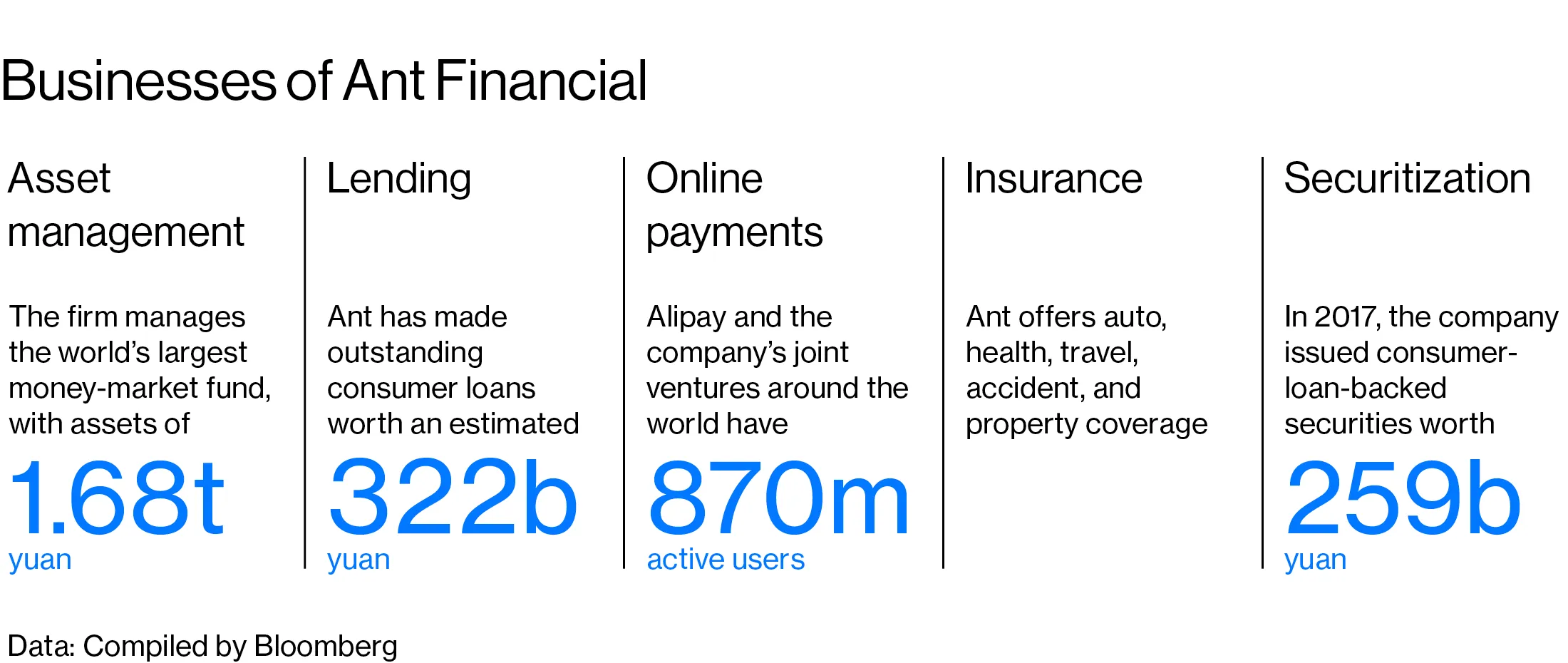 蚂蚁起源于阿里巴巴的在线支付系统,业务已成长为一个无与伦比的金融巨头。蚂蚁的1500亿美元估值远超高盛集团和摩根士丹利。该公司的支付宝及其全球附属机构拥有8.7亿用户,去年处理的交易高达每秒256,000笔。这个支付系统——连同腾讯运营的竞争对手——彻底改变了人们在中国买卖东西的方式,促使前中央银行行长周小川在三月份预测,国家的纸币有一天可能会消失。