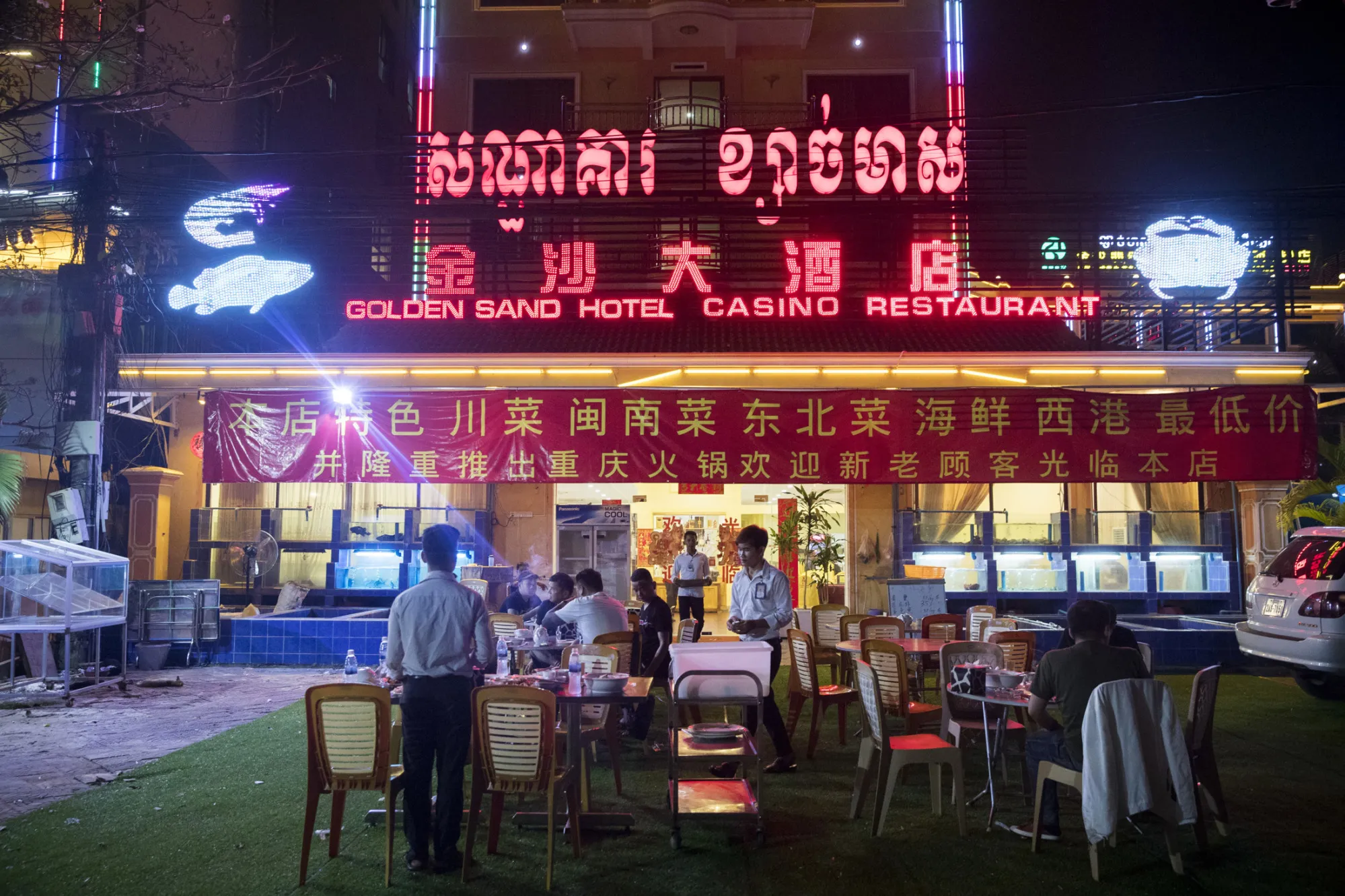 西哈努克市以一位前国王命名,赌场迎合了成千上万涌入柬埔寨南部海岸这块土地的中国游客和工人。在靠近奥切特尔海滩的金沙酒店赌场,来自沈阳等地的商人从厚厚的现金中抽出100美元的钞票,吸着中华烟。即使在工作日的晚上,这里也挤满了人,烟雾弥漫。年轻的柬埔寨女性穿着短裙,站在桌子后面发牌。身穿黑色制服的中国保安在房间里巡逻。