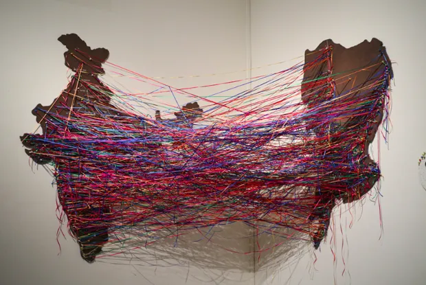 Urbz自己的一个项目在地理上揭示了这些关系。下面的地图是Urbz为去年在孟买举办的展览制作的,展示了城市与印度其他地区之间的多样联系。左侧是整个国家的地图,右侧是孟买的地图。访客被要求在他们的孟买社区和他们的家乡之间钉上一条丝带。结果并不是简单的乡村向城市的迁移,而是两者之间复杂的双向联系网络。