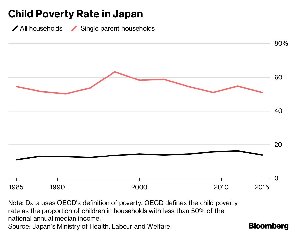 日本的大多数单身母亲的收入低于全国中位数收入的一半,这是经济合作与发展组织定义的贫困线。她们的孩子平均来说更贫穷、受教育程度更低,前景更少——在一个富裕且老龄化的国家中,失去一大部分未来劳动力的代价是无法承受的。在日本,每七个孩子中就有一个经历贫困。