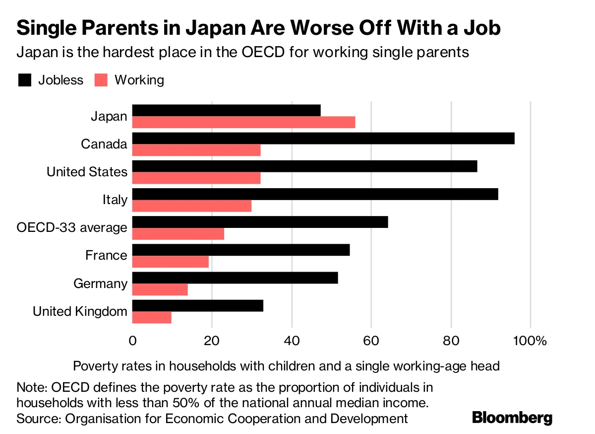 那些能从前配偶那里获得抚养费或儿童抚养费,或与父母同住的人是幸运的。在日本,单亲父母在有工作的情况下更可能生活在贫困中,而不是没有工作,根据经合组织的数据。
