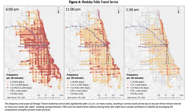 这不是一个全面的解决方案,但至少这项研究提供了关于城市如何与私人交通提供商合作,同时仍然抑制对交通的不利影响的线索,Schwieterman 和 Livingston 写道。例如,像 CTA 这样的机构可以在公交服务急剧减少的时段,补贴外城区的 TNC 乘车,类似于南佛罗里达的 Pinellas Suncoast Transit Authority 和东南宾夕法尼亚交通局所做的那样。
