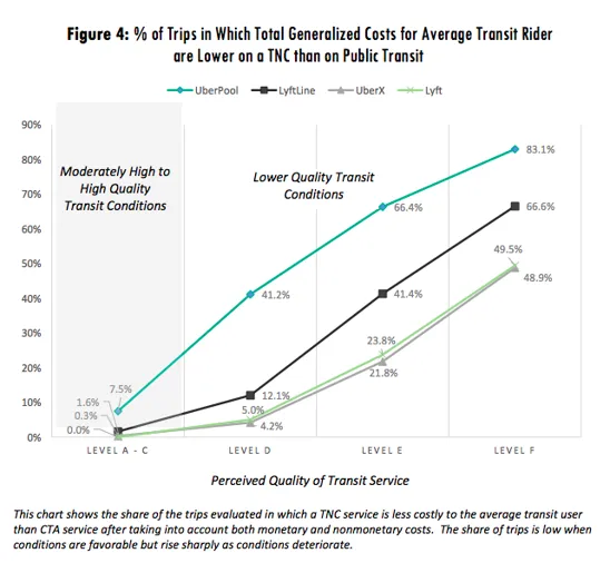 随着服务质量水平的下降,越来越多的Uber和Lyft行程变得具有成本效益。德保罗大学要点是:公交或火车旅行越舒适、安静和可预测(即越接近公共交通质量水平A-C),与TNC相比,乘坐公共交通的成本效益就越高。但随着公共交通服务的恶化——例如,天气糟糕、拥挤严重,或者乘客认为路线在某种程度上不安全——乘坐TNC的成本效益就越高,尤其是UberPool。换句话说,公交车的乘坐体验越糟糕,按需打车的费用就越“便宜”。