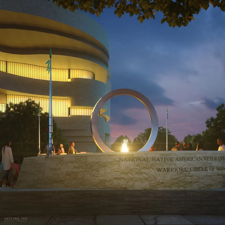 国家土著美国退伍军人纪念碑的建设历时超过二十年。国会在1994年通过了授权建立该纪念碑的立法,远在国家美洲印第安人博物馆成立之前。2013年,博物馆与美国印第安人全国大会联合召开了约30名土著退伍军人和领导人的咨询委员会,开始了对纪念碑设计者的全国搜索。他们随后与16个州和哥伦比亚特区的土著退伍军人及其社区进行了咨询。这些会议为项目的核心动机提供了信息:即建立一个包容和治愈的纪念碑。