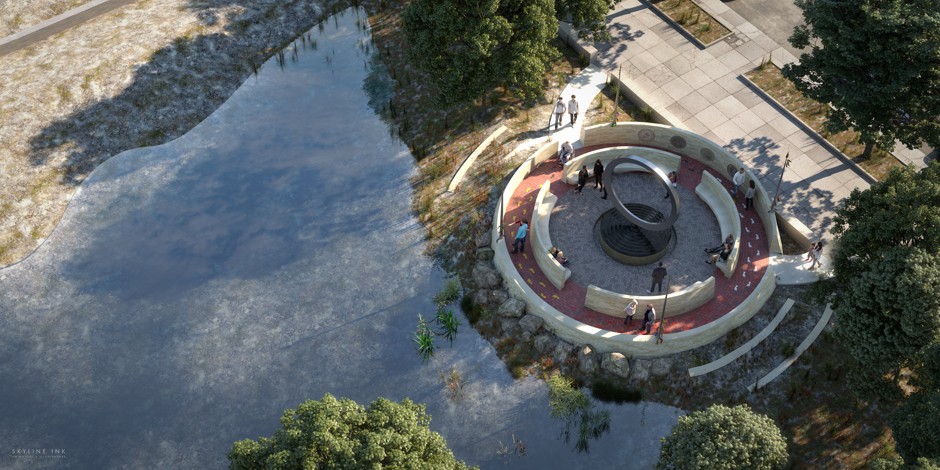 同心圆的金色卡索塔石灰石——与建造博物馆所用的材料相同——将作为反思和参与的长椅。五个(当前)军种的印章将雕刻在其中一个圆环内。普拉特的妻子吉娜和儿子内森共同参与了设计。汉斯·E·布策和托雷·布策来自 布策建筑与城市设计——设计了 俄克拉荷马城国家纪念馆与博物馆 的公司——将帮助普拉特一家实现这个纪念碑。