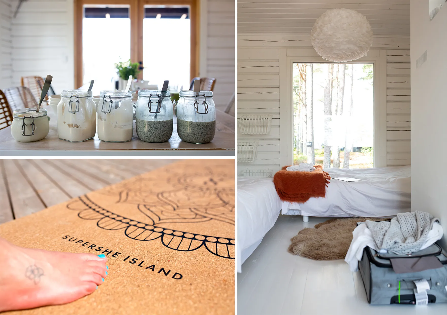 从左上角顺时针方向:由厨师Camilla Kaarla-Haverinen制作的酸奶罐,客舱内的床,以及带有SuperShe标志的软木瑜伽垫。摄影师:Heli Blafield/Bloomberg“这是否可以称为网络交流,或者更像是在进行瑜伽、泡桑拿和参与讨论时的社交和建立关系,这都是值得怀疑的,”她在电话中说。SuperShe的职业发展好处更像是“副产品”,要么通过联系获得,要么仅仅是因为自尊心的提升。两者都是“同样有价值的,”她说。