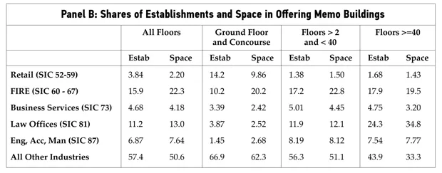 该面板总结了清理数据中建筑物内租户的组成。根据行业的企业份额和行业占用空间的份额报告措施。(FIRE代表火灾、保险和房地产。)律师事务所占40层以上企业的24.3%,但占用34.8%的空间(在最右列)。刘、罗森塔尔和斯特兰奇推动增长和创新的,不仅是经济活动在高楼中的水平聚集,还有垂直聚集。在一栋建筑中向上移动一层对生产力和租金的影响与向一个社区增加3,500名新工人相似。