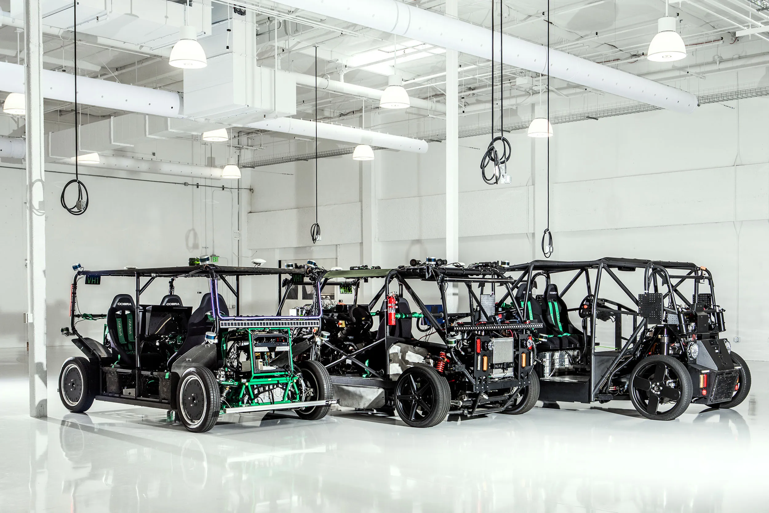 在加利福尼亚福斯特城的Zoox制造总部,三代自动驾驶车辆(VH1、VH4和VH5)。摄影师:Christie Hemm Klok 为彭博商业周刊车辆前后方的LED灯条将向其他驾驶员发送信号,例如提醒机器人出租车发现了前方道路上的障碍物。同样,它的定向音响系统会发出嘟嘟声或咕噜声,告诉人行道上的行人车辆看到了他,或者向快速接近的车辆驾驶员发出警报,提醒他需要放下智能手机并踩刹车以避免事故。早期,Zoox的工程师考虑了一个巨大的安全气囊,在事故发生前包裹住车辆;他们最终选择了更传统的驾驶舱安全气囊。Zoox汽车将配备高端音响、豪华座椅以及某种与乘客互动的对话应用。