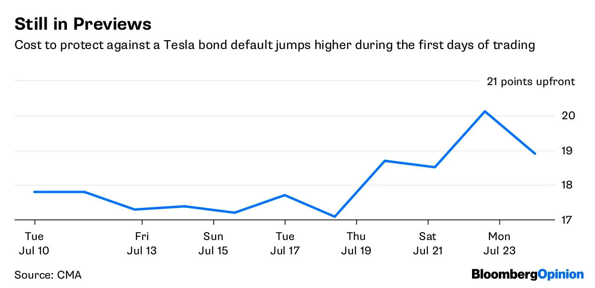 有一种新的,也许不太可靠的方法来 追踪特斯拉公司的焦虑,布莱恩·查帕塔写道:信用违约掉期。