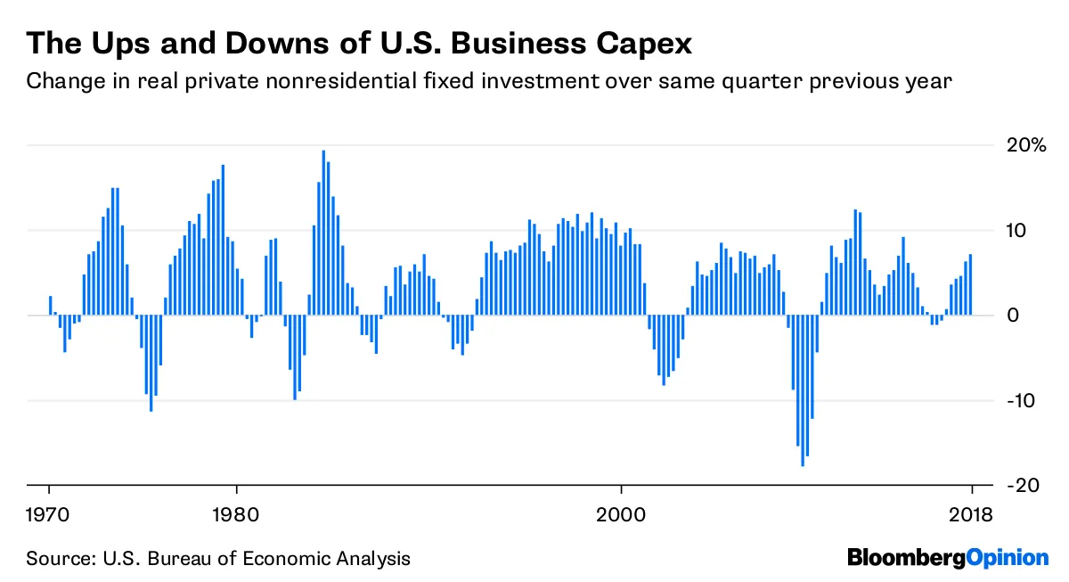 当然,某些人期待的在去年的减税后出现的商业投资热潮在数字上并没有以有意义的方式显现出来,贾斯廷·福克斯写道: