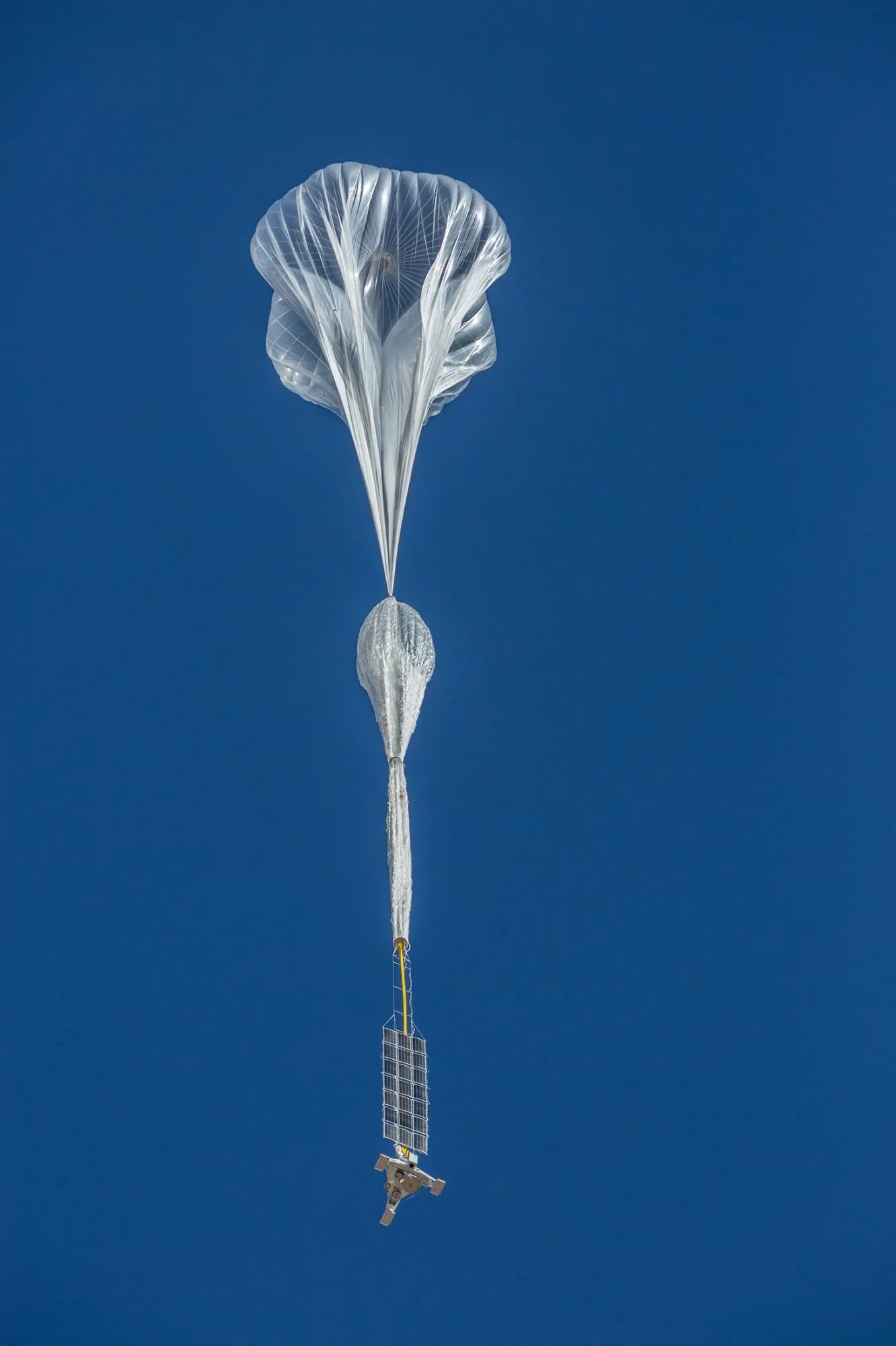 一架 Stratollite 在 2017 年 10 月升起于图森太空港。从上到下:主要升空气球、用于高度控制的辅助气球、太阳能电池板和有效载荷。