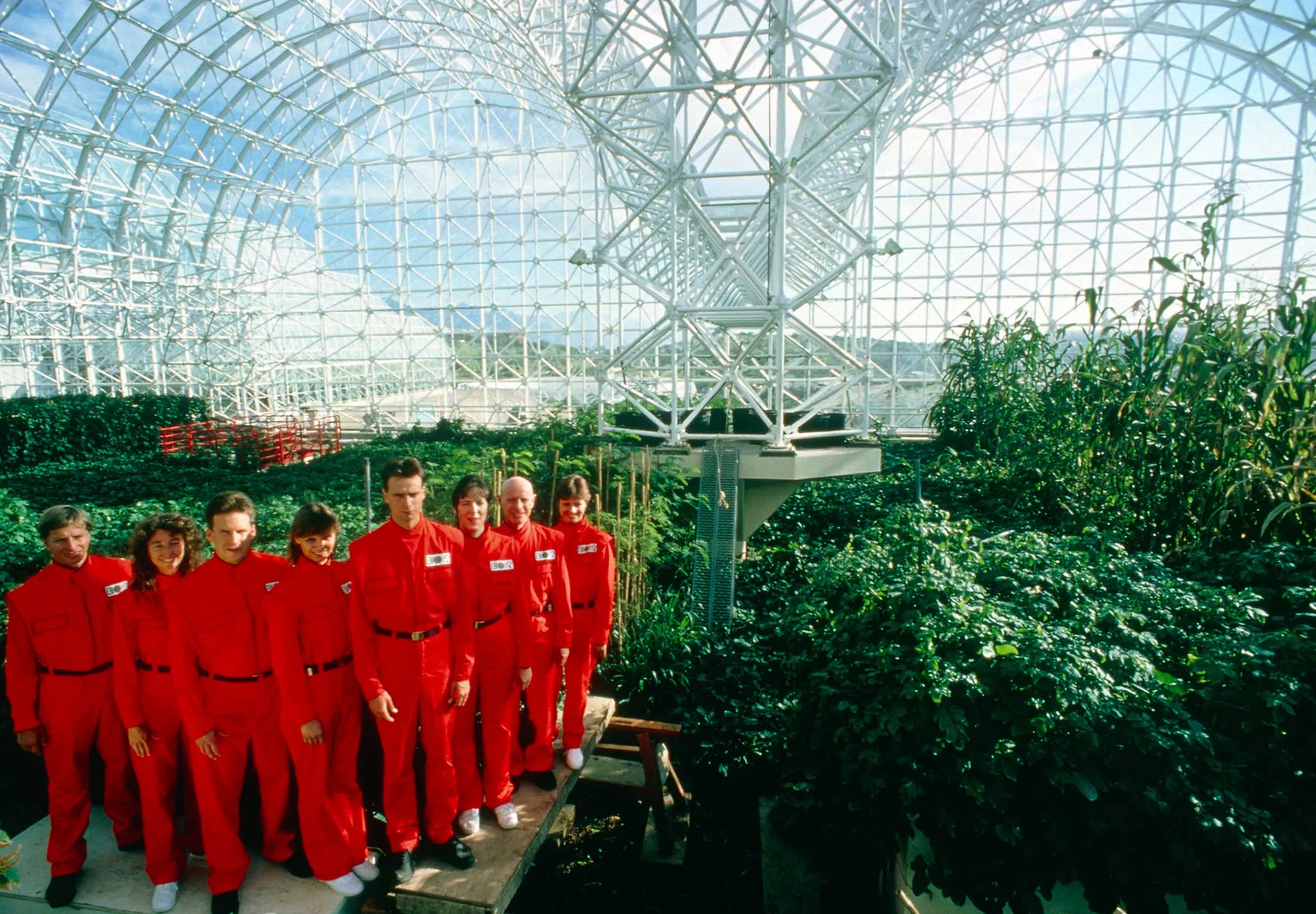 生物圈居民,包括麦卡勒姆(左起第三)和波因特(右侧),在1990年几乎完成的穹顶内。摄影师:看科学/科学来源在世界观整洁工厂的一个角落,有一个红白相间的罐子,足够容纳八个人。它是圆柱形的,两侧和两端都有圆润的隆起,每个隆起上有九个窗户呈圆形排列。尽管波因特和麦卡勒姆大部分时间都在谈论他们气球的商业应用,但他们真正的梦想——他们的生活使命——是将这个舱 capsule送入太空,让人们用新眼光看地球。
