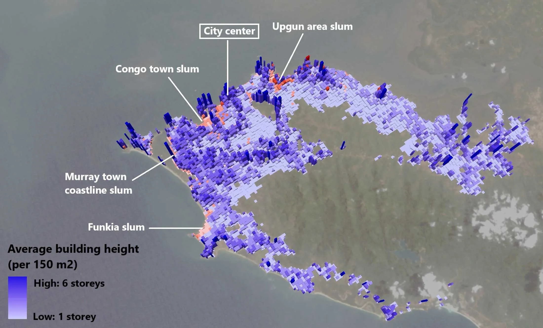 2017年,至少有400人在弗里敦因 暴雨引发的泥石流中遇难。利用来自NASA的Landsat和欧洲航天局的Sentinel-1卫星项目的图像,叠加人口普查和其他数据,世界银行的研究人员展示了城市的杂乱发展在一定程度上导致了生命的损失。