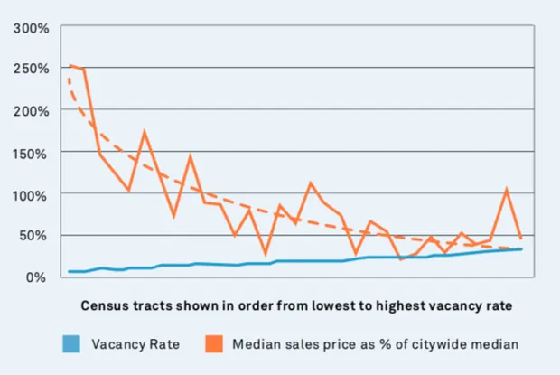 (来源:空置率:美国人口普查局 / 销售价格:Boxwood Means, PolicyMap, www.policymap.com)2018年。林肯土地政策研究所。来自艾伦·马拉赫,《隔壁的空房子:理解和减少美国的空置和超空置现象》。根据研究,高空置率的社区很少能恢复。空置“首先是其他问题的症状——集中贫困、经济衰退和市场失灵,”研究指出。这意味着解决方案必须超越仅仅拆除废弃建筑。研究敦促地方政府使用诸如“点状衰败”征用权、空置物业接管和土地银行等工具,加快从一个业主到另一个业主的过渡。