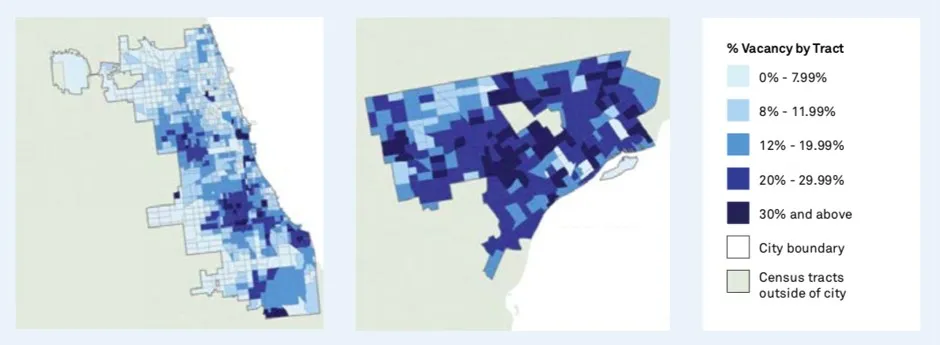 (数据:美国人口普查局。地图由Adrienne McDonnell提供,感谢社区进步中心)2018年。林肯土地政策研究所。来自Alan Mallach的《隔壁的空房子:理解和减少美国的空置和超空置现象》。在一些城市,如芝加哥,超空置现象集中在特定社区。在巴尔的摩,空置率从1990年到2010年向城市中心外扩散。在底特律,超空置现象遍布整个城市。