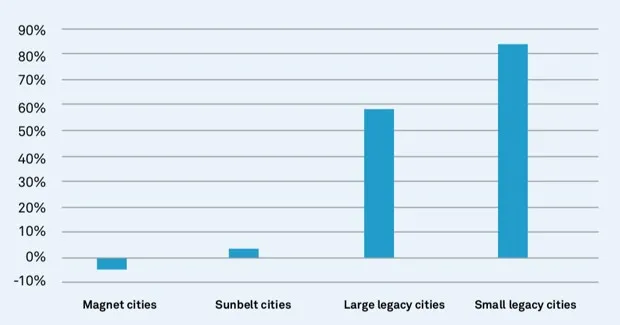 在传统城市中,空置问题比在吸引城市或阳光带城市更为严重。2010年,小型传统城市的空置率约为17%,大型传统城市为15%,而阳光带城市为11%,吸引城市仅为7%。
