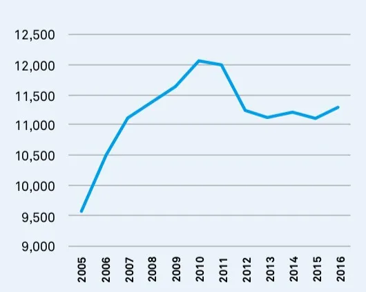 在复苏过程中,空置单元的数量有所下降,但今天的数量仍然超过2005年前的水平。被认为是暂时空置的住房单元——既不在市场上,也不为未来入住而保留,或季节性使用——从2005年的370万增加到2016年的580万,增长超过50%。