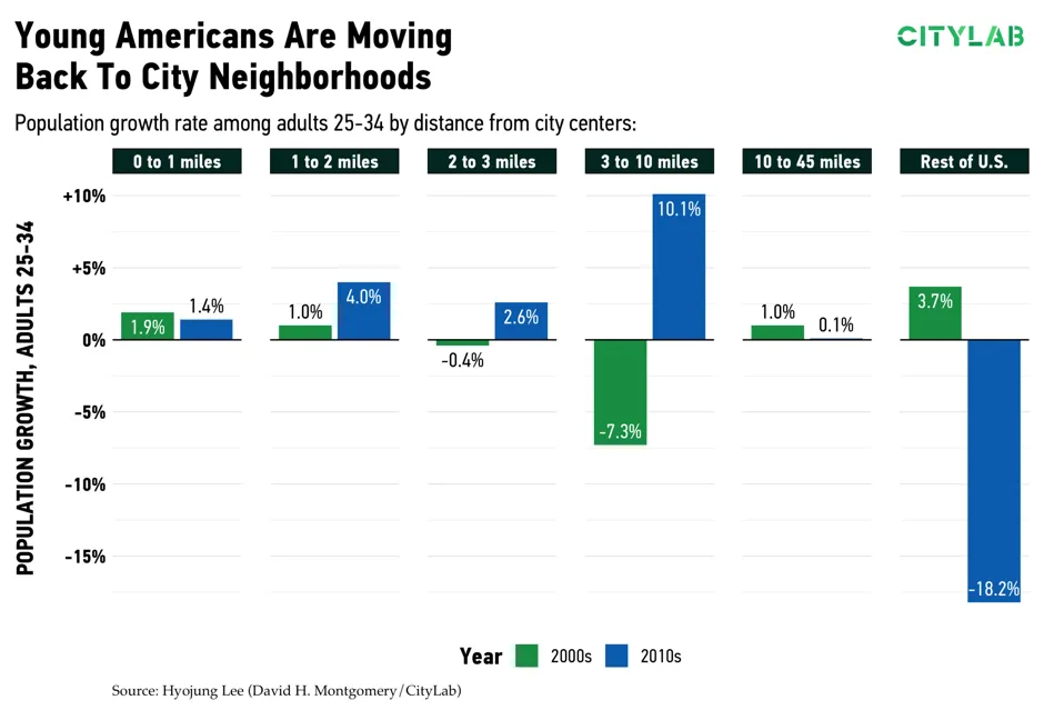 研究的结论是:在1990年代和2000年代,居住在市中心和郊区的年轻人的人口增长率均高于全国平均水平。另一方面,在这些十年中,整个城市的人口却在减少。“[T]人口分布向市中心和郊区转移,以牺牲内城区(和边缘)地区为代价,这不仅与回归城市的论点一致,也与其反对者,即主张持续郊区增长的人士一致,”李写道。