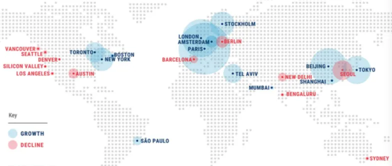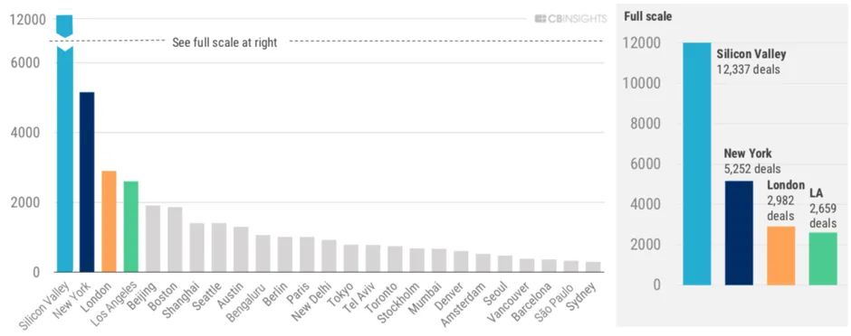 初创公司和风险投资的世界仍然集中、聚集且不均匀,少数重磅中心占据了投资的绝大部分。尽管旧金山仍然是全球最重要的中心,但其主导地位可能开始减弱,因为纽约、伦敦以及北京和上海等大城市正在崛起,成为主要竞争者。